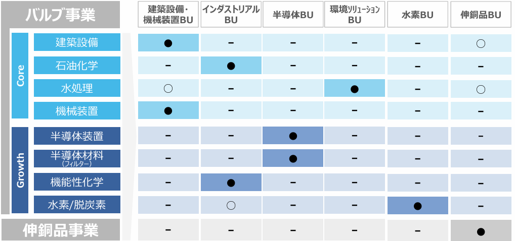 バルブは、配管内の流体(水・空気・ガスなど)を「流す」、「止める」、「流量を調整する」等の機能を持つ機器で、ビル・住宅設備用、給水設備用、上下水道用、消防設備用、機械・産業機器製造施設、化学・医薬・化成品製造施設、半導体製造施設、石油精製・コンビナート施設、水素サプライチェーンなど様々な分野で使用されている。同社は、鋳物からの一貫生産を特徴とし(日本で最初に「国際品質保証規格ISO9001」の認証を取得した)、住宅・ビル設備等の建築設備分野に使用され、耐食性に富む青銅製や経済性に優れた黄銅製の汎用バルブ、或いは付加価値の高いボールバルブ等の工業用ステンレス鋼製バルブといった主力商品で高い国内シェアを有する。