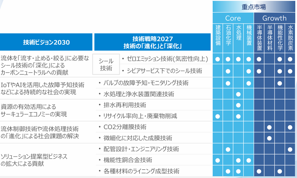 中長期ターゲット市場は8つの市場区分。現行コア市場(建築設備、石油化学、水処理、機械装置)を基盤に成長分野・新規分野であるグロース市場(半導体装置、半導体材料(フィルター)、機能性化学、水素/脱炭素)を強化させていくことにより、収益構成を変えてゆく考え。