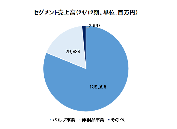 事業は、バルブ事業、伸銅品事業、及びホテル・レストランの経営(ホテル事業)等のその他に分かれ、24/12期の売上構成比は、それぞれ81.1%、17.3%、1.5%。