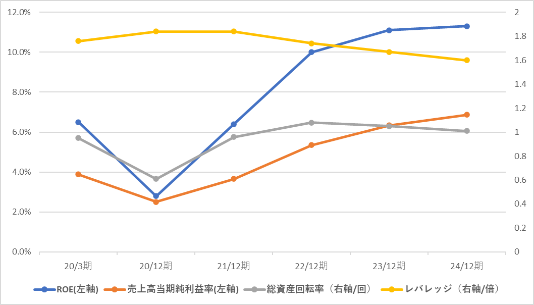 24/12期のROEは11.3%となり、3期連続で2ケタ台を確保した。PBR1倍超は定着化しているが、収益性改善に伴う更なる向上が期待される。