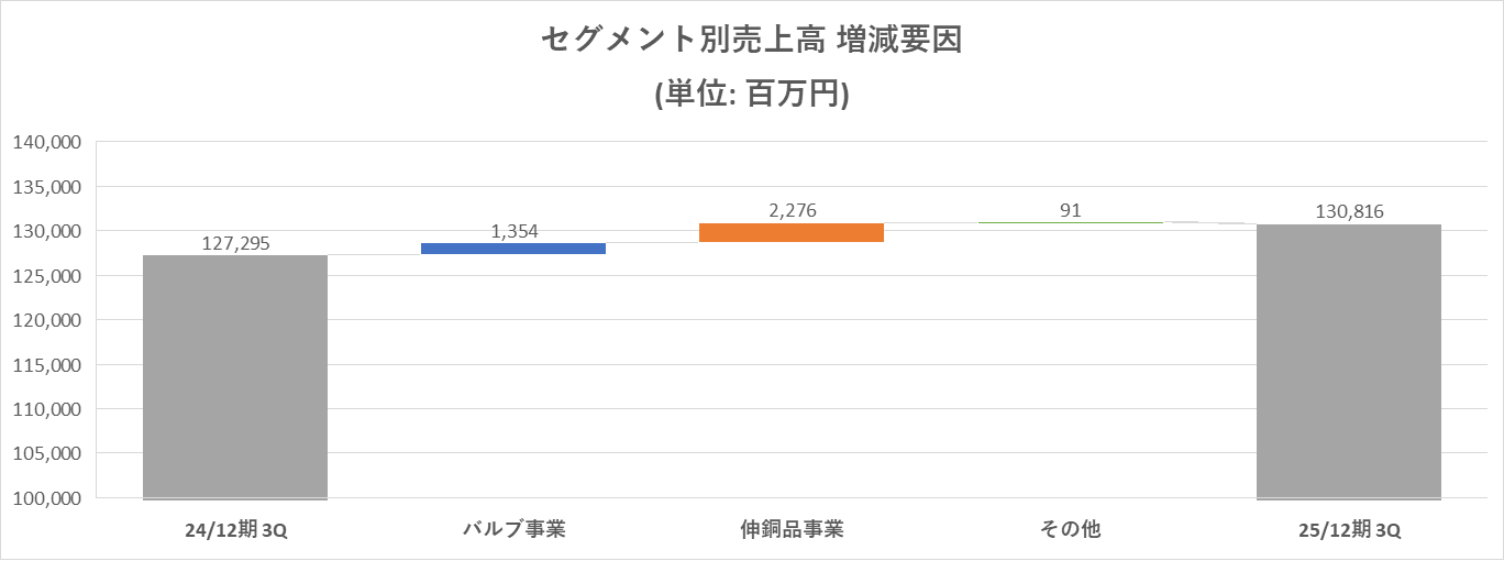 売上高は前年同期比2.8%増の1,308億16百万円。バルブ事業は同1.1%の増収。半導体装置向けの回復が予想より遅れている。しかし、価格改定効果や海外市場での販売量増加もあり増収となった。伸銅品事業は販売量が増加したこと等により、同10.4%の増収。