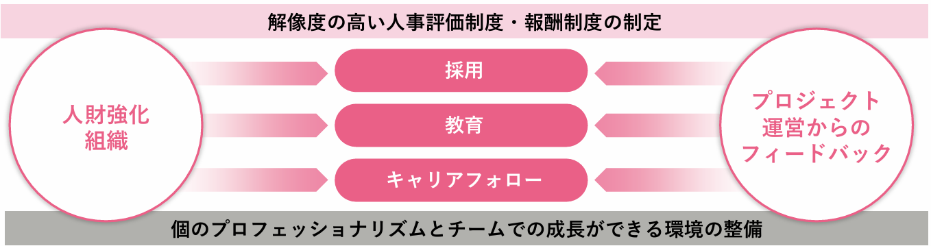 ●風土・・・人材強化に繋がる教育ノウハウが豊富に蓄積されており、技術習得に関する教育カリキュラムを充実させる。また社外メンバーとも渡り合えるよう自律的人材へ促す風土作りを進める。