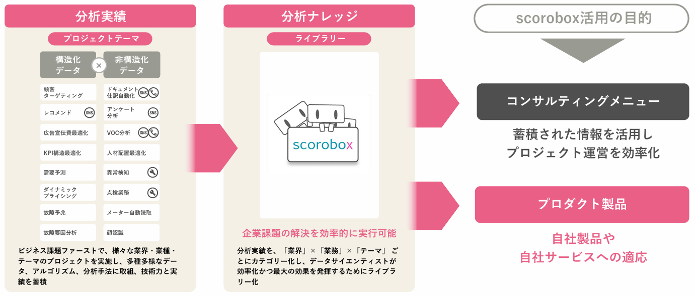 300を超えるライブラリー「scorobox」を有しており、経験の浅い技術社員も活用できるビジネスモデルが確立している。