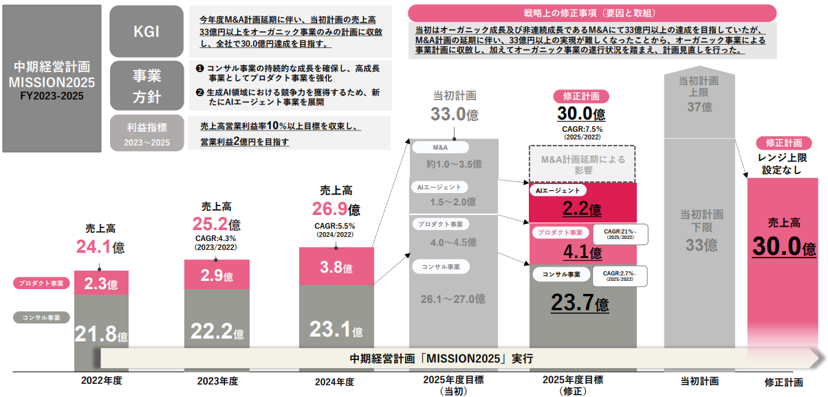 中計最終年度は当初計画33億~37億円達成を目指していたが、M&A計画の延期により、オーガニック成長のみによる30億円達成を目指す。コンサルティング事業の組織改編や攻略領域の見直しに向けた取組を進め、成長著しいプロダクト・AIエージェント事業においては営業攻勢を加速させ、成長エンジンとなるべく事業を強化させ、事業ポートフォリオ改革を実現させる。