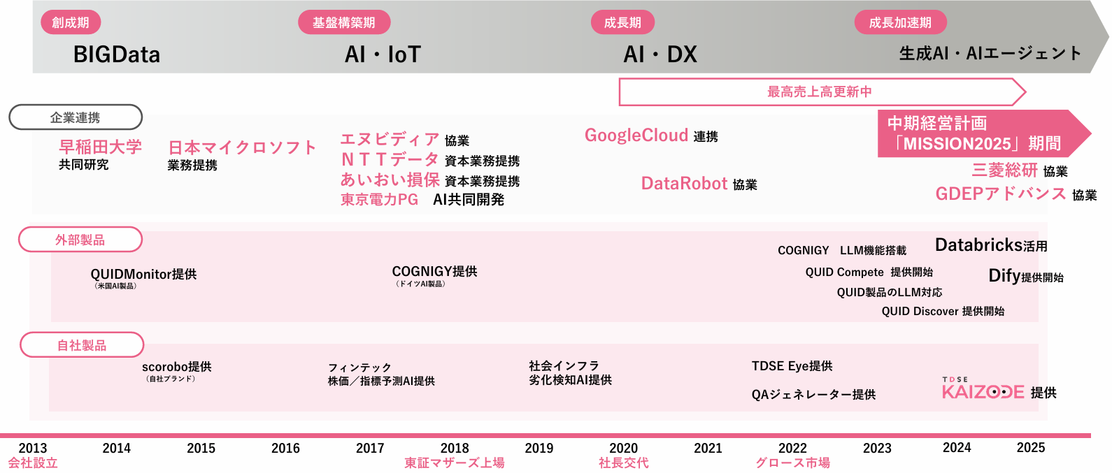 2013年、企業経営にAIやデータ活用が求められる時代の到来を予見し、ビッグデータ事業を展開するために株式会社テクノスジャパン(東証プライム、3666)がテクノスデータサイエンス・エンジニアリング株式会社(現 TDSE)を設立。同年には早稲田大学とビッグデータ活用研究に関する産学連携を開始。