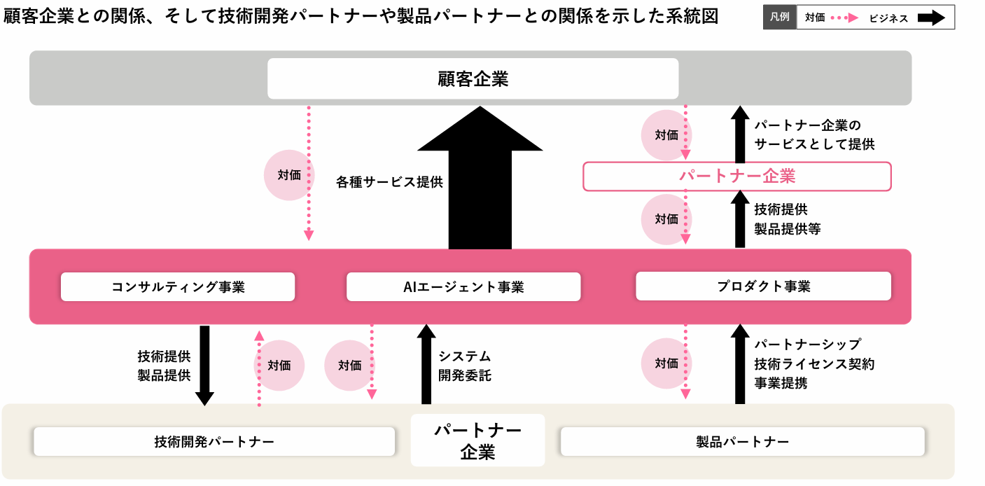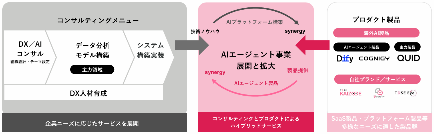 安定成長事業の「コンサルティング事業」と、高成長事業の「プロダクト事業」、および両事業のハイブリッドビジネスとなる「AIエージェント事業」の3つの事業を展開。