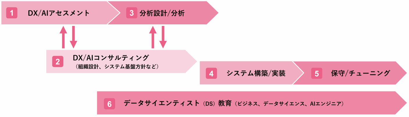 5 保守/チューニング ・システム保守 ・AIモデルチューニング | 6 データサイエンティスト教育 ・エグゼクティブ教育 ・データサイエンティスト教育(基礎~実践) ・e-Learning提供(Aidemy社コンテンツ) |
