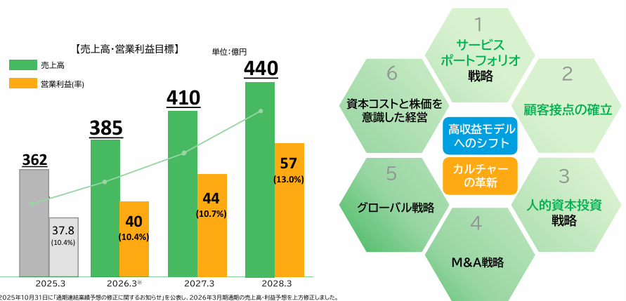 また、現在同社は、26/3期を初年度とする3か年の中期経営計画「Next 50 Episode Ⅲ "JUMP!!!"」を策定し、戦略テーマとして「高収益モデルへのシフト」と「カルチャーの革新」の2つを軸に、サービスポートフォリオ戦略、顧客接点の確立、人的資本投資戦略、M&A戦略、グローバル戦略、資本コストと株価を意識した経営からなる6つの重点戦略を積極的に推進している。