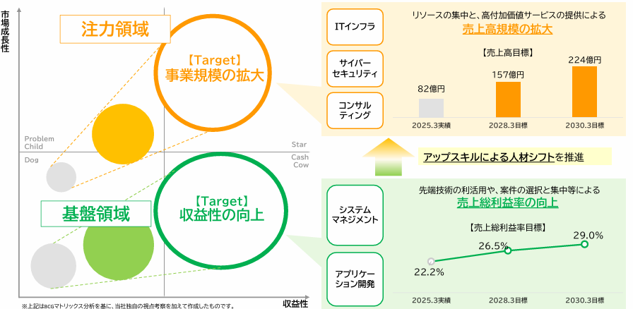 同社グループは、2026年3月期を初年度とする3か年の中期経営計画「Next 50 Episode Ⅲ "JUMP!!!"」を策定し、戦略テーマとして「高収益モデルへのシフト」と「カルチャーの革新」の2つを軸に、サービスポートフォリオ戦略、顧客接点の確立、人的資本投資戦略をはじめとした6つの重点戦略を推進している。
