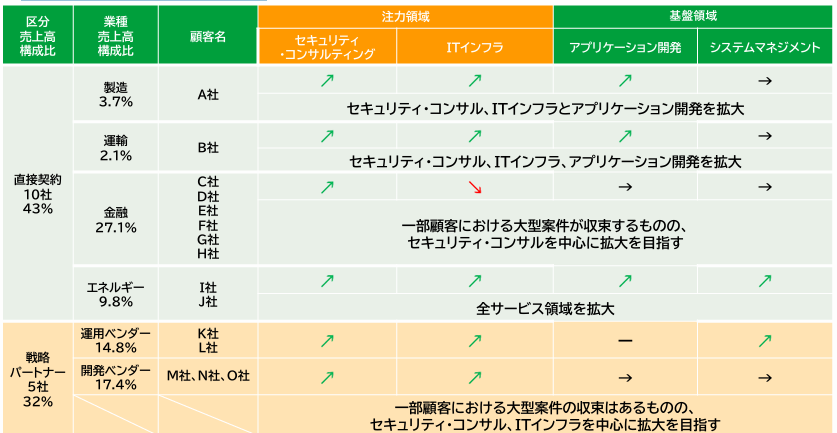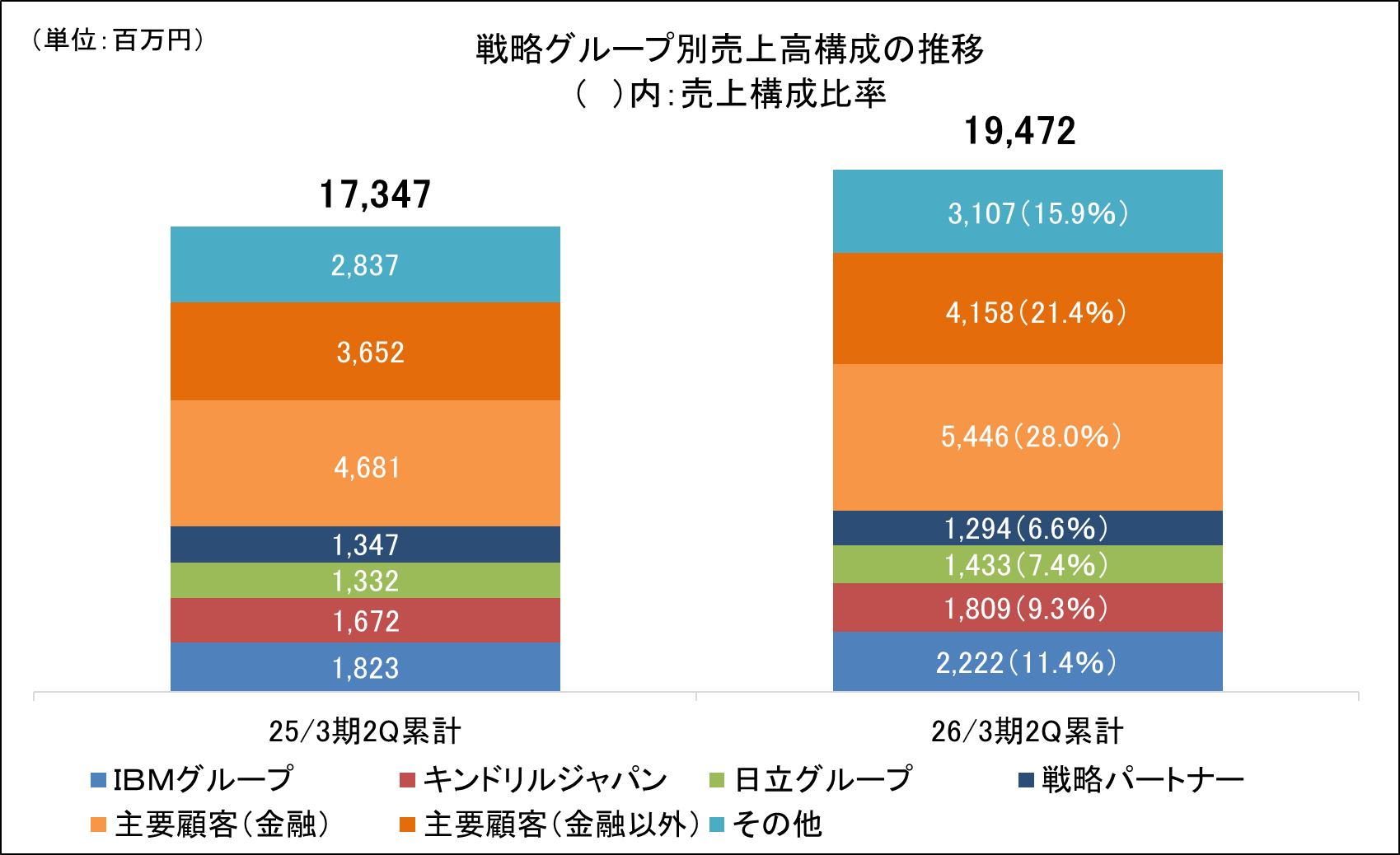 26/3期第2四半期累計において、戦略グループ別では、エネルギー関連顧客におけるアプリケーション開発、ITインフラ案件の継続、運輸関連顧客におけるアプリケーション開発案件の新規受注等が寄与したIBMグループ、金融関連顧客におけるシステムマネジメント、ITインフラ案件の継続と拡大、製造関連顧客におけるセキュリティ案件の受注拡大が寄与したキンドリルジャパン、アプリケーション開発、ITインフラにおける受注拡大等が寄与した日立グループにおいて売上高が前年同期を上回った。また、クラウド関連の構築・脆弱性対応案件の受注拡大、保険関連顧客におけるアプリケーション開発の新規大型案件の受注、営業強化による案件の拡大が寄与した主要顧客(金融)と製造、エネルギー関連顧客におけるアプリケーション開発の新規大型案件の受注、複数顧客におけるセキュリティ案件の受注拡大、エネルギー関連顧客におけるITインフラ案件の新規受注等が寄与した主要顧客(金融以外)でも売上高が増加した。一方、アプリケーション開発における案件の終了等が影響した戦略パートナーでは、売上高が前年同期比を下回った。