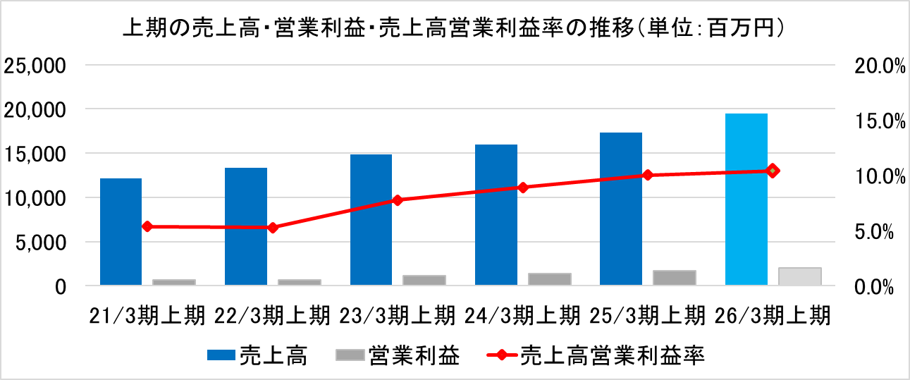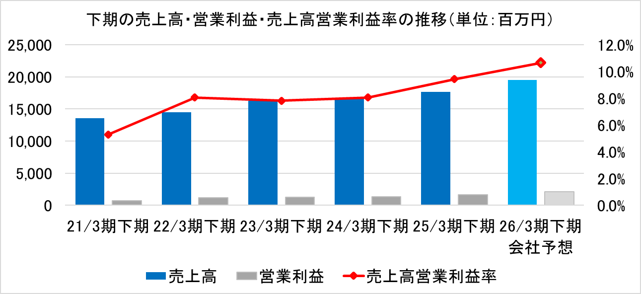 26/3期下期は、前年同期比10.6%の増収、25.2%の営業増益の会社予想。また、売上高営業利益率は、同1.3ポイント上昇の10.7%の見込み。