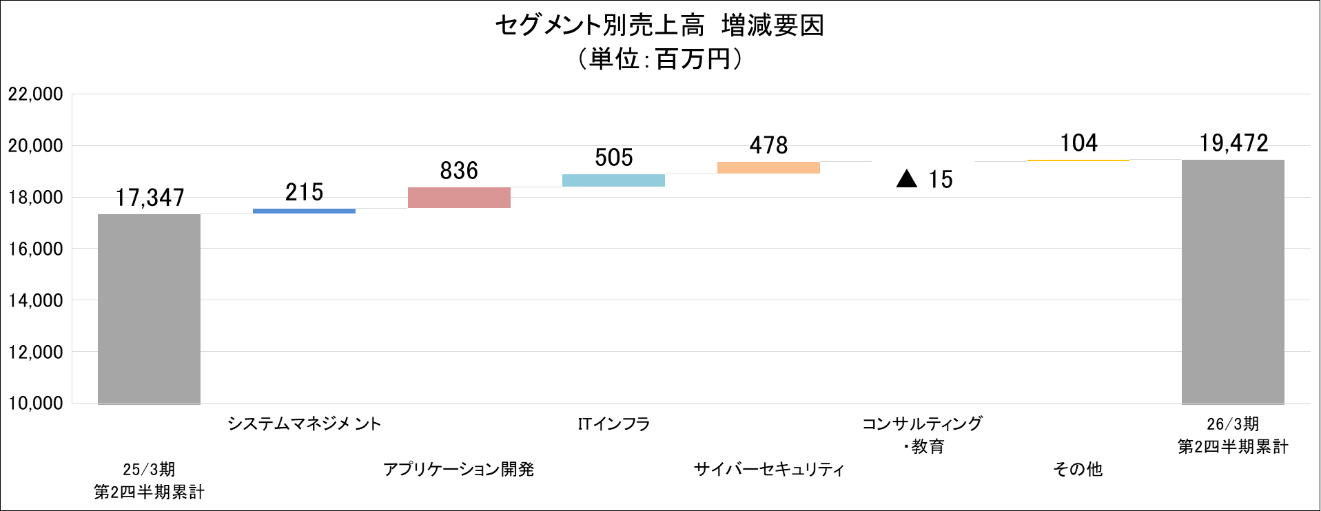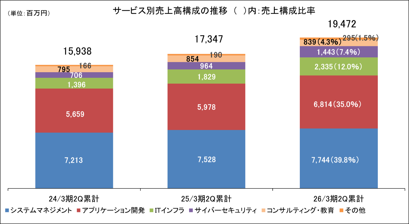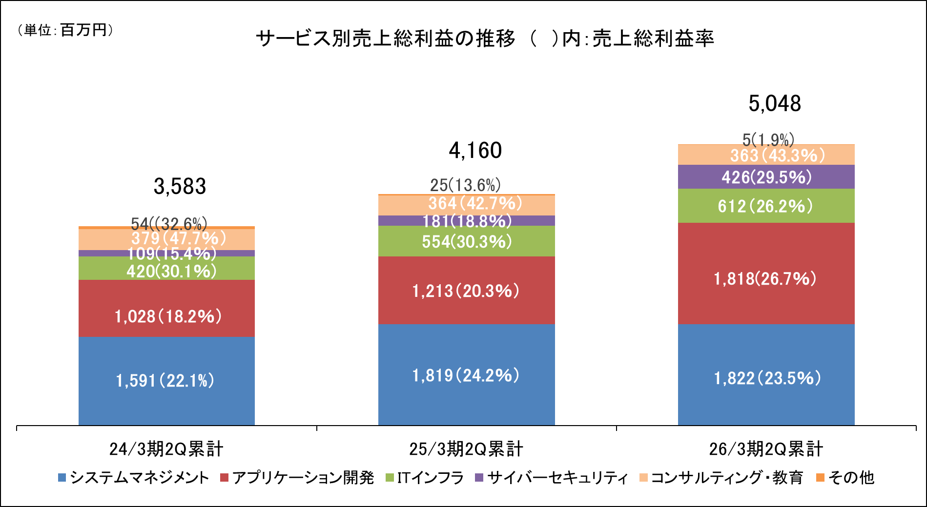 26/3期第2四半期累計の売上高は194億72百万円であった。一部顧客における案件の終了や研修の受注減少があったコンサルティング・教育の売上高が前年同期を下回ったものの、それ以外の全てのサービスで売上高が前年同期を上回った。システムマネジメントは、金融関連顧客や大手ITベンダーにおける受注が拡大した。価格適正化に向けた単価の見直しも寄与した一方、一部案件の縮小がマイナスに影響した。アプリケーション開発は、金融、エネルギー、製造関連顧客における受注が拡大した他、営業強化により大手ITベンダーとの連携による新規顧客の獲得が寄与した。ITインフラは、金融およびエネルギー関連顧客における受注が拡大した他、大手ITベンダーとの連携による取引の拡大が寄与した。サイバーセキュリティは、サイバー攻撃対策の需要増にともなう、官公庁関連をはじめとした複数顧客における受注の拡大が寄与した。