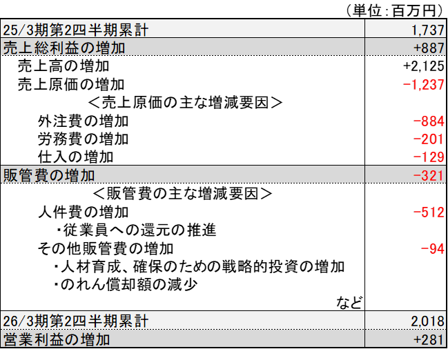 同社の26/3期上期決算は、前年同期比12.2%の増収、同16.2%の営業増益となった。第2四半期(7-9月)の営業利益率が前年同期、前四半期ともに若干低下したことが少し残念であったが、従業員への還元や人材育成・確保のための戦略的投資を増加した影響であり仕方ない収益性の低下と言えよう。下期においては、上期或いは、前年下期よりも利益率が向上する計画となっている。売上総利益率の改善と戦略的投資の効果により下期の収益性をどれ位向上させることができるのか注目される。