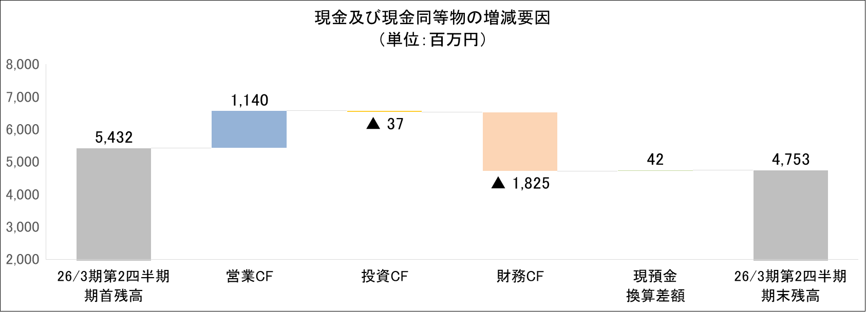 CFの面から見ると、売上債権と法人税等の支払額の増加などにより営業CFのプラスが縮小した。一方、保険積立金の解約等による収入の増加などにより投資CFのマイナスが縮小し、フリーCFのプラスが拡大した。その他、配当金の支払額の増加などにより財務CFのマイナスは拡大した。以上により、期末のキャッシュ・ポジションは前年同期比3.8%減少した。