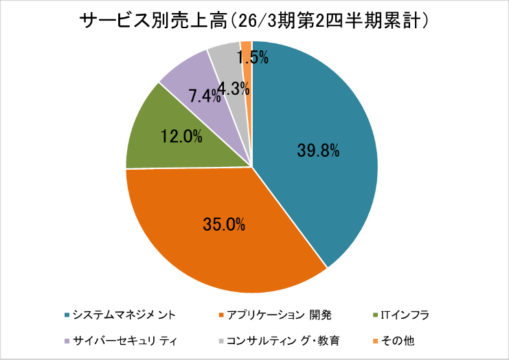 売上高は、システムマネジメント、アプリケーション開発、ITインフラ、サイバーセキュリティ、コンサルティング・教育、その他に分かれ、サービス別の概要と売上構成比は次のとおり。