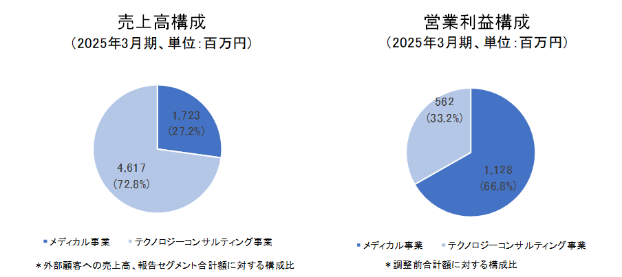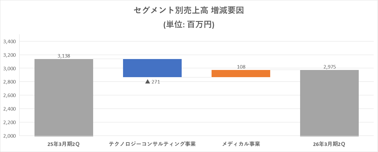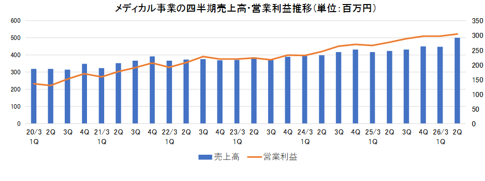 - 26年3月期中間期の売上高は前年同期比5.2%減の29億75百万円。メディカル事業は増収だったが、テクノロジーコンサルティング事業が減収となった。営業利益は同12.6%増の6億65百万円。売上総利益率が同前年同期38.2%から41.8%に改善、販管費が減少し営業利益率が前年同期18.8%から22.4%へ伸びたことで2桁増益を確保した。経常利益は前年同期比7.5%増の6億76百万円、純利益は同27.9%増の5億66百万円。各段階利益は過去最高を更新した。