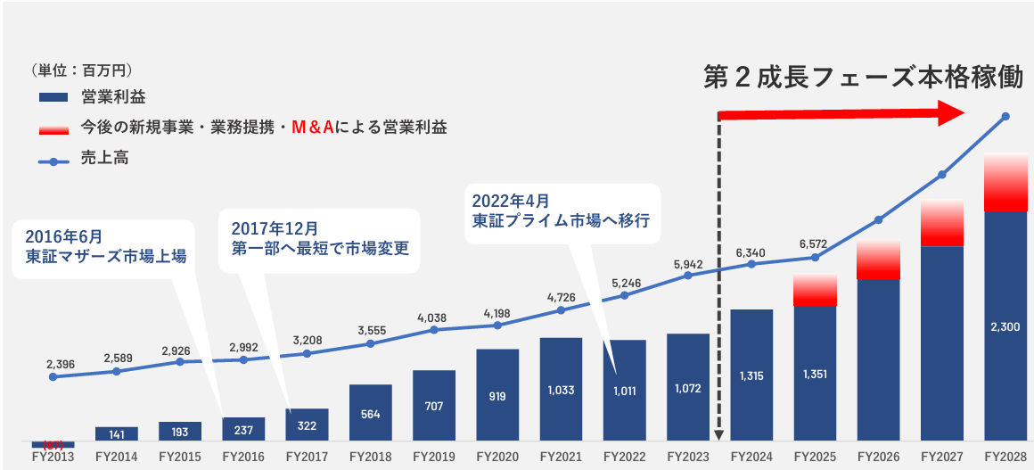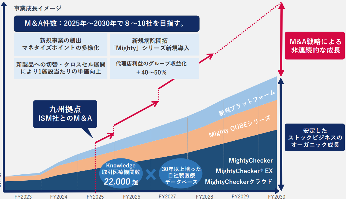 両事業において、新規プラットフォーム複数展開(メディカル事業)、Mighty QUBE® Hybrid・MightyChecker® EXクロスセル本格開始(メディカル事業)、組織変更による日本におけるコンサルティング営業強化(テクノロジーコンサルティング事業)、グローバルマーケットへの進出(テクノロジーコンサルティング事業)、大口顧客の獲得推進(テクノロジーコンサルティング事業)、M&Aと資本業務提携(両事業)といった施策を推進し、25年3月期より始まっている第2成長フェーズを本格的に稼働させ、売上・利益の急速な拡大を目指す。