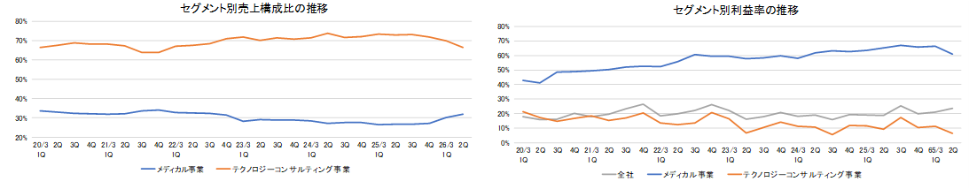 - メディカル事業では期初から掲げていたM&A戦略がISM社買収をきっかけに本格的に動き始めている。M&Aに係る費用を吸収して中間期においてもしっかりと2桁増益を確保したことも評価できる。テクノロジーコンサルティング事業では米国関税の影響があったものの、3Q以降の拡大を見据えた新規案件の立ち上げを開始しており、既に下期挽回の準備が出来ているようだ。