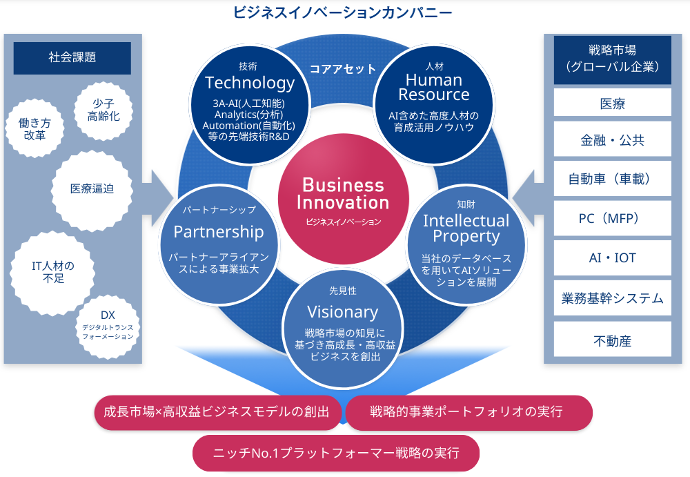 「技術」「人材」「知財」「先見性」「パートナーシップ」の5つのコアアセットを基にビジネスイノベーションを創出し、少子高齢化、医療逼迫、IT人材の枯渇、DXといった課題を解決することを自社の社会的な責務・存在意義であると考えている。