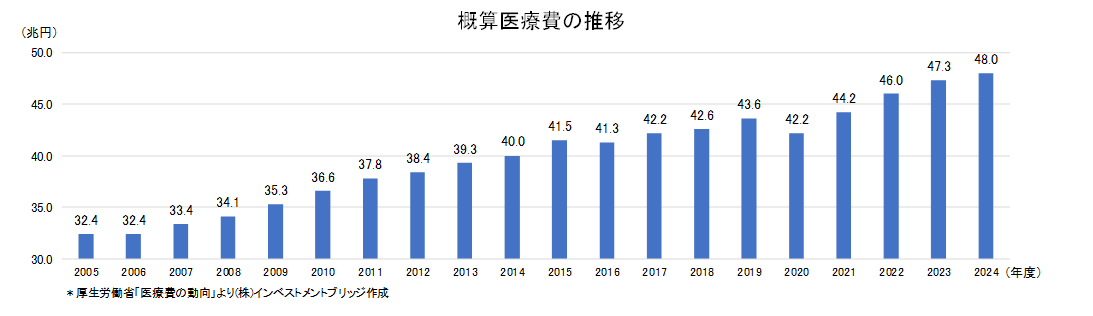 2024年度の概算医療費(労災・全額自費等の費用を含まない。医療機関などを受診し傷病の治療に要した費用全体の推計値である国民医療費の約98%に相当)は48.0兆円と過去最高を記録した。