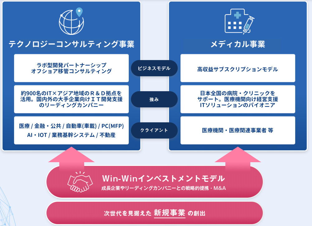 医療機関向け経営支援ITソリューションのリーディングカンパニーとして、病院等の医療機関あるいは関連施設に関わる、医療情報システムのソフトウエア商品の開発・販売、受託開発、医療データ分析及びコンサルテーションを行うメディカル事業と、日本及びフィリピンを中心拠点として戦略市場である医療・金融/公共・自動車(EV)・モバイル・不動産等の領域に向け、数々のITソリューションサービスを提供するテクノロジーコンサルティング事業の二本柱で展開。スクラップ&ビルドによる事業の再構築を経て、高収益ビジネスモデルを確立している。さらには、リーディングカンパニーや成長企業との戦略的提携やM&Aを通じて事業成長の加速を図るWin-Winインベストメントモデルの推進と、プラットフォームビジネス等の既存事業とは異なる軸足の新規事業の早期確立を目指す。