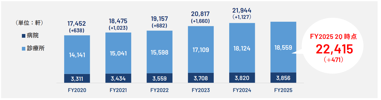 医療現場の業務効率を改善し経営品質を高める「Mightyシリーズ」製品は、その豊富かつ有用な機能が高く評価されている。2024年4月から医師にも適用となった働き方改革や診療報酬改定の影響により医療機関のDX投資が加速。既存ユーザーの切替に注力しつつ、順調に新規ユーザーが増加している。2025年9月末時点のユーザー数は、病院(20床以上)で3,856施設・シェア約48%、診療所(20床未満)で18,559施設・シェア約18%の合計22,415施設と、トップシェア製品である。
