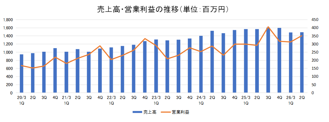 通期予想は修正なし。26/3期は、売上高が前期比3.6%増の65億72百万円、営業利益は同2.7%増の13億51百万円、経常利益は同1.7%増の13億64百万円の予想。
