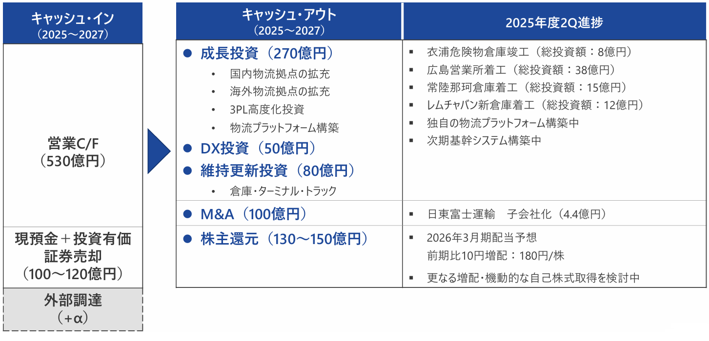 内部留保資金は、物流拠点の確保、保管設備の増強ならびに輸送力強化・環境対応のための車両・機械荷役装置への投資、IT・DXへの対応、M&Aによる事業拡大などに活用し、資本の効率向上に努めております。