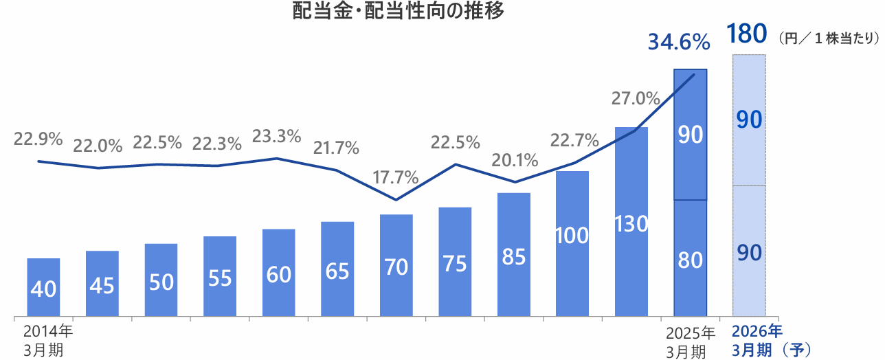第9次中期経営計画では、配当性向は、3年間の連結ベース平均で35%以上を目標としております。