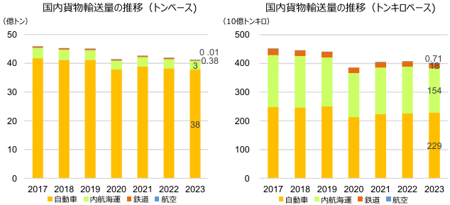 国土交通省が発表した「我が国の物流を取り巻く状況」によれば、国内貨物輸送量は、ほぼ横ばいで推移していたが、2020年度は大幅に減少した。その後は回復したものの、2019年以前の水準には届かない。尚、国際貨物輸送量については、2013年以降は減少傾向にあり2020年に減少、その後は回復しているものの、2019年の水準には届いていない。