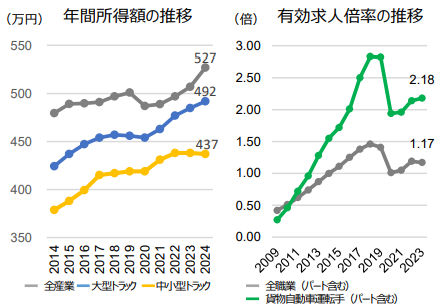また構造的な人手不足も運輸業界にとっては大きな課題となっている。物流分野における労働力不足が近年顕在化しており、トラックドライバーが不足していると感じている企業は増加傾向。トラックドライバーの有効求人倍率は、全職業平均より約2倍高い。年齢構成は全産業平均より若年層と高齢層の割合が低く、中年層の割合が高いほか、労働時間も近年は減少傾向にあるものの、依然として全産業平均より約2割長い。関連企業はIT活用を含めた様々な施策による効率化に取り組んでいるほか、運送費用の値上げを試みている。