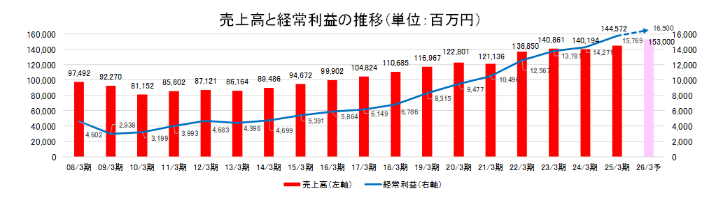 2026年3月(予) | 153,000 | 16,000 | 16,500 | 12,000 | 614.59 | 180.00 |