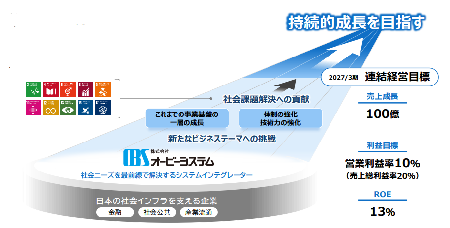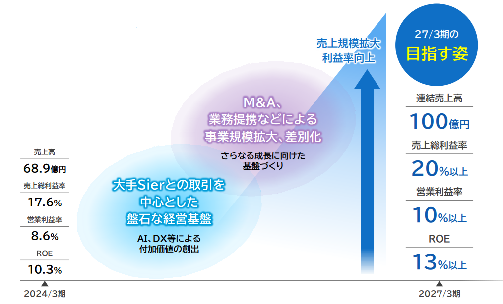 - 25/3 期を初年度とする3年間の中期経営計画が進行中である。新たなビジネステーマとして、「これまでの事業基盤の一層の成長」「体制の強化、技術力の強化」を掲げている。社会課題解決と自社の成長を目指し、27年3月期に「連結売上高100億円、売上総利益率20%以上、営業利益率10%以上、ROE13%以上」の達成を図る。