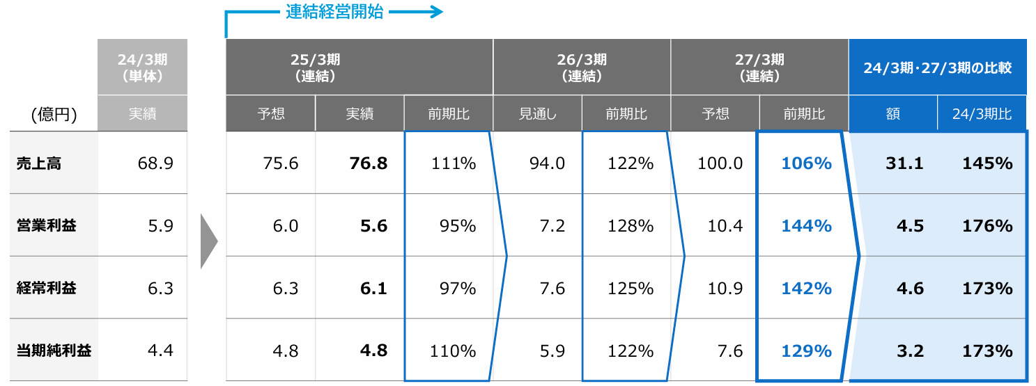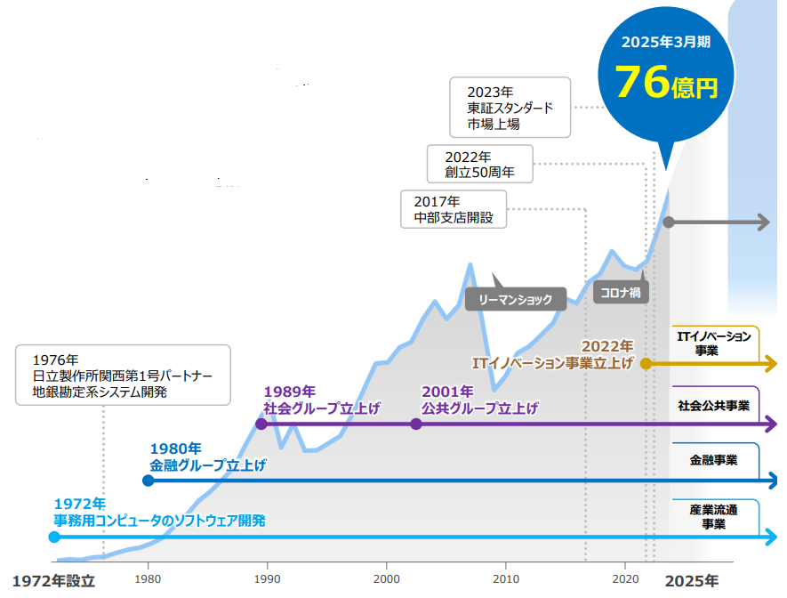 バブル崩壊、リーマンショック、コロナ禍など幾度か困難なフェーズがあったが、安定した取引基盤をベースに成長を続け、2023年6月に東証スタンダード市場に上場。これを機に事業拡大が加速しており、2025年3月期は2期連続で過去最高売上高を更新した。なお、2025年3月期より連結決算を開始している。