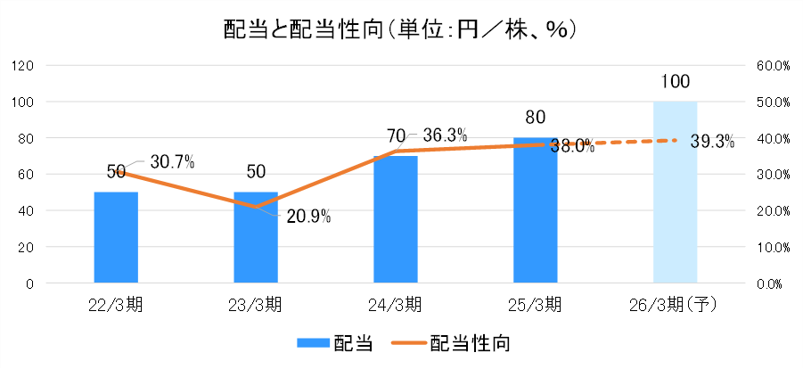 - 通期予想は修正なく、26/3期は売上高が前期比22.3%増の94億円、営業利益は同28.0%増の7億20百万円を予想。グリーンキャット子会社化による事業規模拡大で売上増加を見込む。クラウド化など旺盛なシステム投資需要の継続が見込まれ、人員増強での対応や連結拡大による顧客の多様化、シナジー効果などにより、2桁増収を計画。下期からは新卒の従業員が収益貢献する見通し。期末配当も修正なく前期から10.00円/株増配の50.00円。通期で100.00円/株。予想配当性向は39.3%。早期に40%以上へと引き上げる方針である。