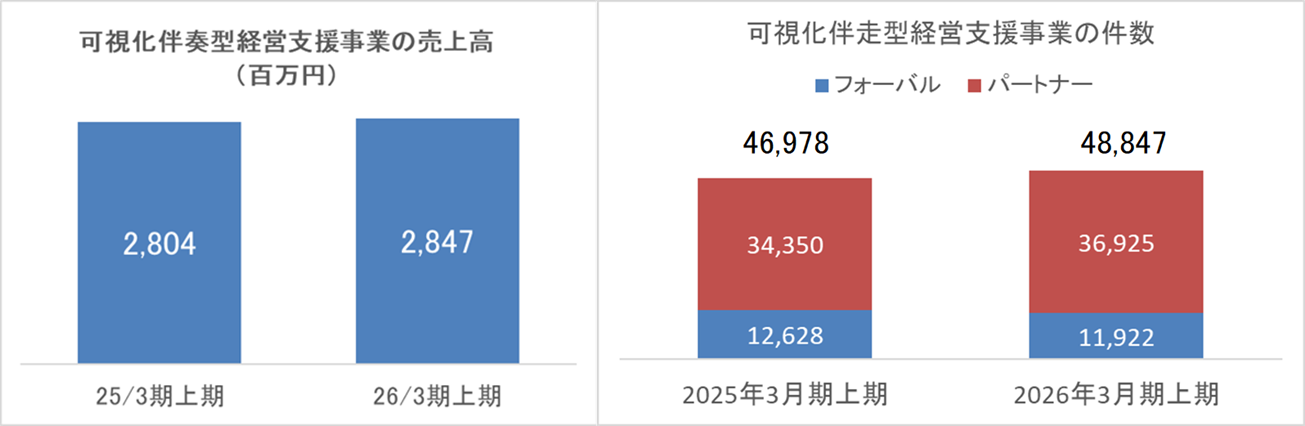 同社の26/3期上期決算は、前年同期比0.3%の増収、同20.6%の経常減益となった。中小・小規模企業や自治体におけるDX推進の機運の高まりを受けて可視化伴走型経営支援サービスが堅調に推移した一方で、㈱エルコムが新紙幣発行に伴う特需の反動で減少したことが影響したものである。また、事業拡大に伴う人員増強や情報処理費、地代家賃やのれんの償却費の増加により販管費が増加したことも影響した。今後の成長に向けた必要不可欠な費用の増加であり致し方ない先行投資と言えよう。今上期に実施した先行投資がいつの時期から果実をもたらすのか注目される。また、フォーバルビジネスグループでは、企業ドクターによる可視化伴走型経営支援事業の売上高と件数がKPIである。今上期の可視化伴走型経営支援事業の売上高は前年同期比1.5%の増加となり、可視化伴走型経営支援事業の件数は同4.0%の増加となった。順調な成長が確認できた一方で少し物足りなさを感じる伸び率である。しかし、きづなPARKの分析によると、重症患者の企業が現状で全体の7割以上を占めている。また、日本企業約295万社の60%以上が欠損法人となっている。2024年10月~2025年9月の間に、同社がきづなPARKを活用し伴走支援した債務超過ではない営業赤字の企業の約4割が黒字へ転換したとの検証成果が確認されている。驚きの結果であり、今後同社の可視化伴走型経営支援を採用する企業が増加するものと期待される。下期において可視化伴走型経営支援事業の売上高と件数をどこまで拡大することができるのか注目される。