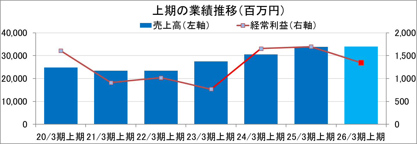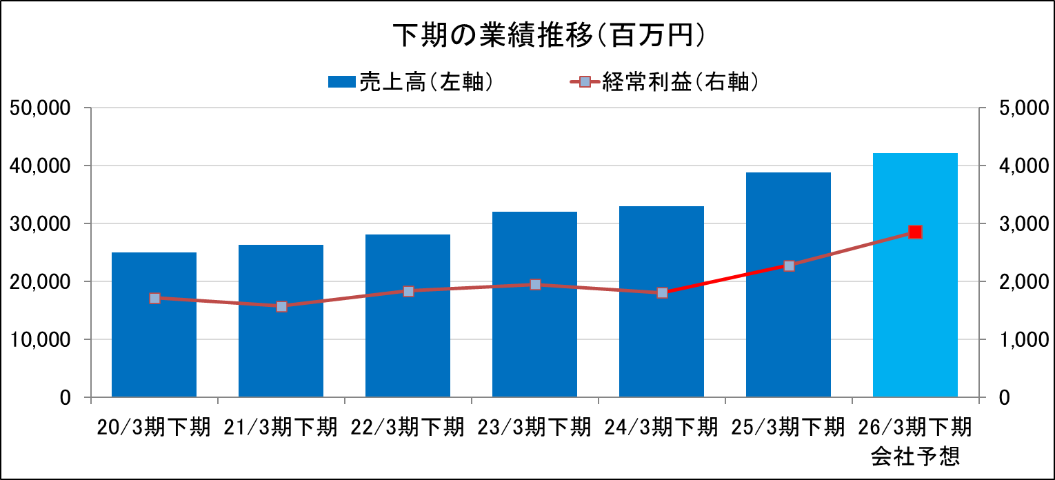 26/3期下期は、前年同期比8.4%の増収、同25.3%の経常増益の会社計画となっている。また、営業利益率は6.8%と前年同期比で1.3ポイント上昇する見込みである。
