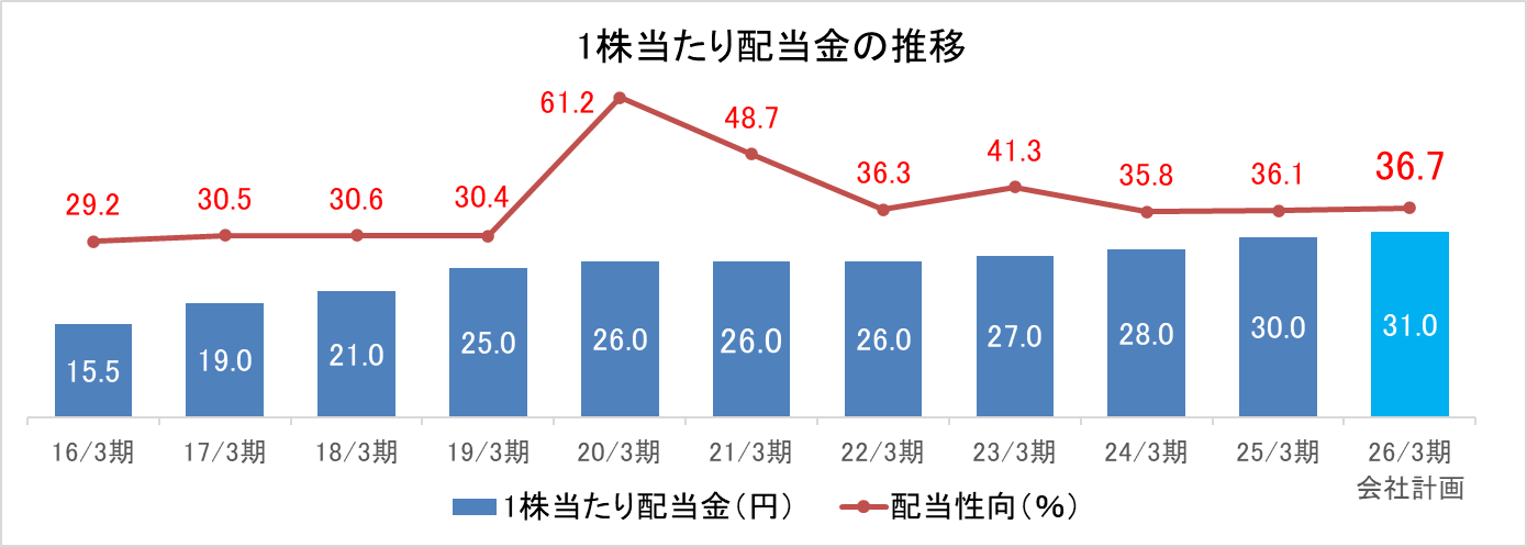 同社は、配当による株主への利益還元を重要な経営課題のひとつと認識している一方で、今後の事業計画、財務状況等、中長期的観点から内部留保と安定した成果配分、双方のバランスにも配慮して配当金を決定している。25/3期の1株当たり年間配当金は、この方針を踏まえ、前期と比較し2円増配の30円とした。