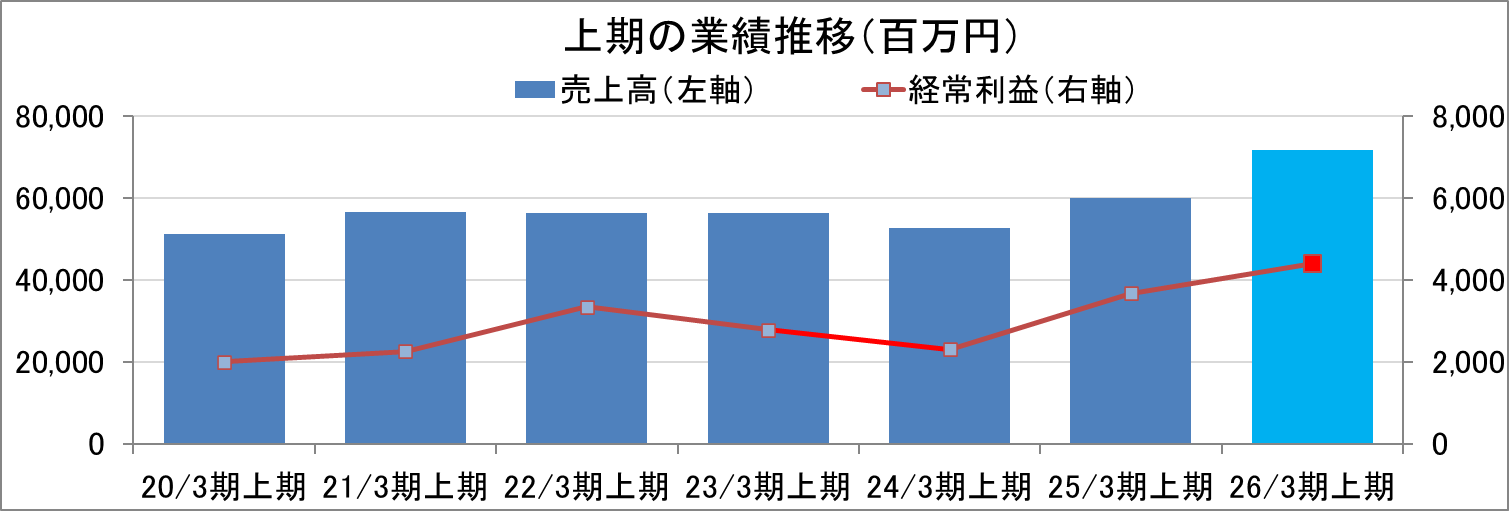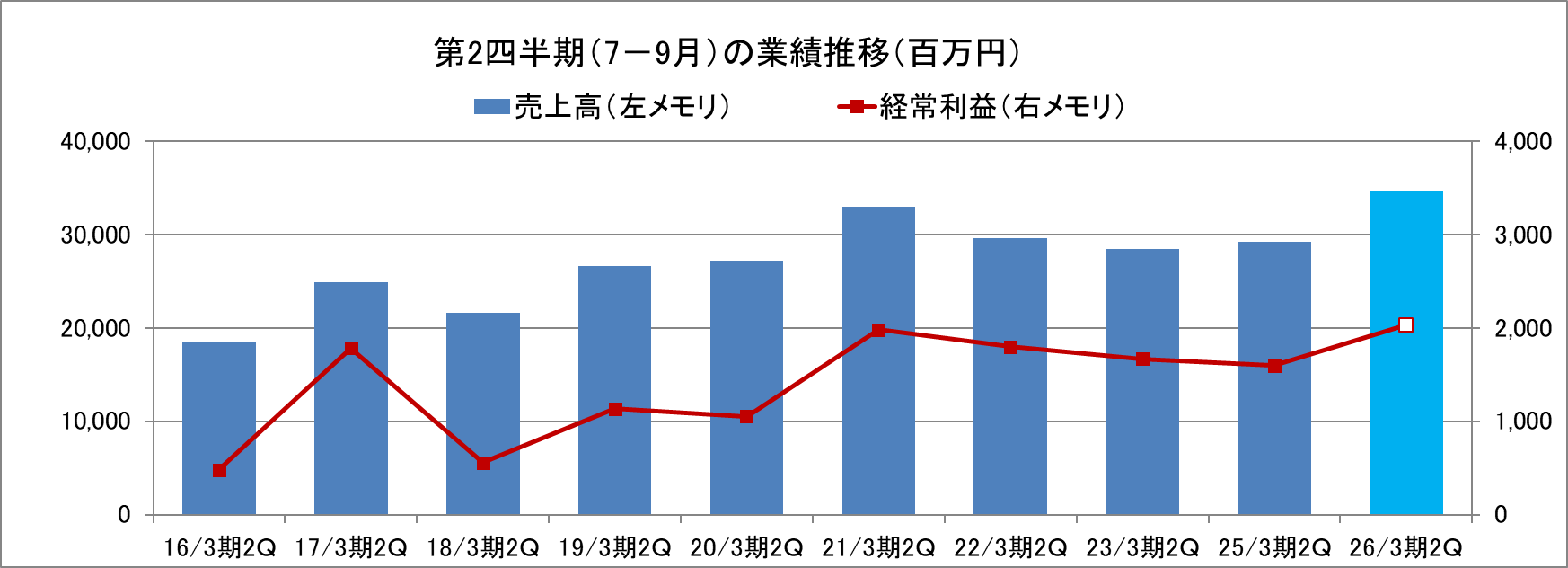 第2四半期が終わり、26/3期の会社計画は、売上高が前期比1.7%増収の1,260億円、経常利益が同18.4%減益の57億円の予想から変更なし。