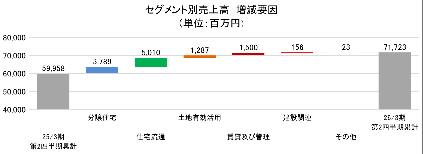 - 26/3期第2四半期累計は前年同期比19.6%の増収、同20.0%の経常増益。売上面では、分譲住宅セグメントにおいて、大型分譲マンションの竣工引渡しに加え、自由設計住宅の引渡しも好調に推移した。住宅流通セグメントは、前期からの仕入強化により豊富な在庫を確保できたことに加え、中古マンションの旺盛な需要が追い風となり、引渡しが大幅に増加した。土地有効活用セグメントも、依然好調な個人投資家向け一棟売賃貸アパートに加え、賃貸住宅等建築請負の受注済み工事が順調に進捗し、土地有効活用セグメントにリンクする賃貸及び管理セグメントも想定通り増収となり、全セグメントが好調に推移した。利益面では、売上総利益率が前年同期を下回った。これは主に、前年同期に収益性の高い大型素地販売を計上した影響によるものである。売上高の先行指標である受注契約残高は603億円と、第2四半期末としては高水準となり、受注状況も好調に推移した。