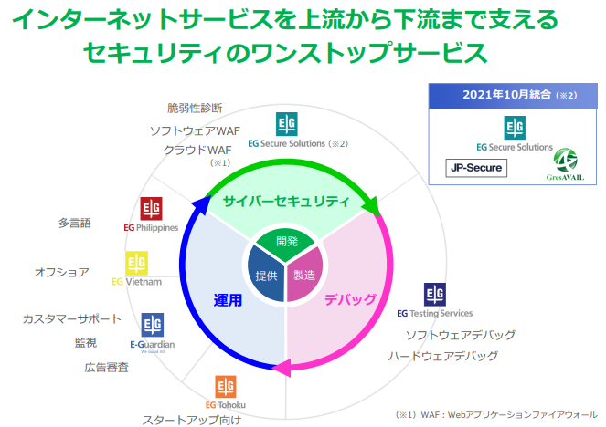 経営理念として「We Guard All」を掲げ、グループでサイバーセキュリティからデバッグ、運用まで、上流から下流までの、ネットセキュリティのワンストップサービスを提供している。20年以上にわたる運用実績を誇り、国内外に拠点を展開。顧客数は1,000社を超える。グループは、投稿監視・カスタマーサポート・広告審査等を手掛ける同社の他、連結子会社5社。サイバーセキュリティ分野においてWAF・脆弱性診断等を提供するEGセキュアソリューションズ(株)、Webシステム・IoTのデバッグ(第三者検証)を手掛けるEGテスティングサービス(株)、投稿監視を中心に展開し、ローコストオペレーションを強みに低単価案件の収益化能力に優れるイー・ガーディアン東北(株)、及びグローバル展開の拠点であるE-Guardian Philippines Inc. E-Guardian Vietnam Co., Ltd.。