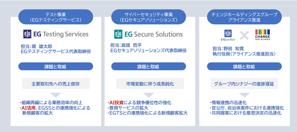 例えば、(1)業務執行体制については、執行役員制度を採ることで、市場変化に迅速に対応し、成長を加速させることを目指す。なお、テスト事業では「主要取引先への売上依存」サイバーセキュリティ事業では「市場変動に伴う成長鈍化」、チェンジホールディングスグループとのアライアンス推進では「グループ内シナジーの進捗遅延」を課題として認識しており、これらにそれぞれの担当役員がスピード感をもって対処していくことになる。