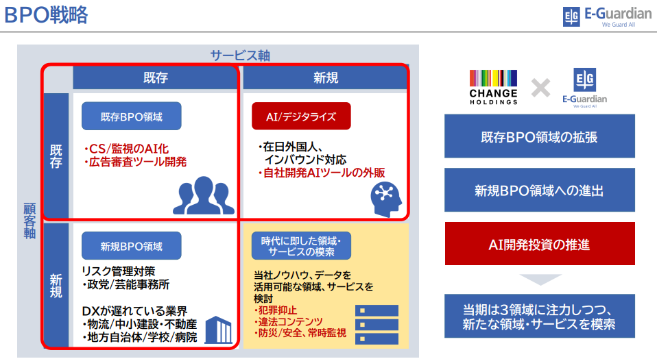 ソーシャルネットワークサービス(SNS)やECメディア等のソーシャルメディアへの投稿を監視する投稿監視や問い合わせ対応を24時間365日体制で提供しており、多様なニーズを取り込むべく、風評調査、多言語対応、サイト運用、分析等にサービスの幅を広げている。人による目視監視(ヒューマンリソース)に加え、投稿監視システム「kotonashi」や人工知能型画像認識システム「ROKA SOLUTION」の活用で対応している。また、2024年5月にはインターネット上の著名人が使用された画像や不適切画像を検知するための画像認識モデルを自由に構築し運用できるヒューマン・イン・ザ・ループAIシステム「ROKA Custom」も開発しサービスへ導入した。生成AIを活用した翻訳システム「EG Trans Works」の開発、メールテンプレートツール「hinagata」への生成AI実装などAI・システム開発、活用に積極的に取り組んでいる。低単価案件等には、ローコストオペレーションを強みとするイー・ガーディアン東北(株)が対応している。決済事業者の加盟店審査を代行する「加盟店審査・登録申請サポートサービス」やリアルタイムAI動画監視フィルタの開発等も行っている。