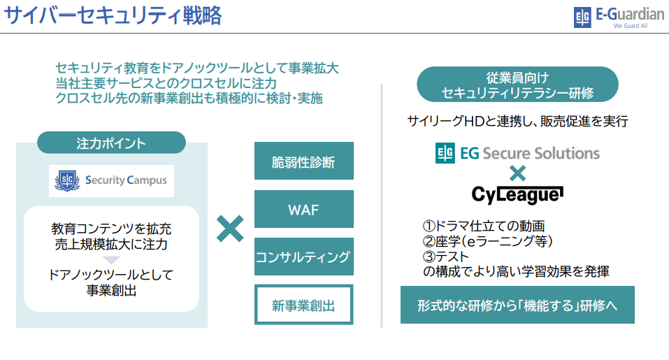 EGセキュアソリューションズ(株)が提供する、ウェブアプリケーション等の脆弱性診断(脆弱性検査)や各種サイバーセキュリティに関するコンサル・支援、クラウドセキュリティやサイバー攻撃対策に関するソリューション、WAF「SiteGuard(サイトガード)シリーズ」によるWebサイトの脆弱性を悪用した攻撃を防御するソリューション等の収益が計上されており、多くの企業にサービス提供を行っている。足元では、生成AIや大規模言語モデル(LLM)を活用したサービスに潜む脆弱性を専門的に診断する「LLM脆弱性診断サービス」の提供なども開始した。