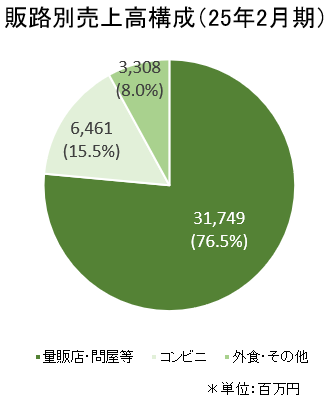 全国の量販店、小売店、卸などが販売先であり、販路別構成(25年2月期)は、量販店・問屋等76.5%、コンビニ15.5%、外食・ その他8.0%となっている。
