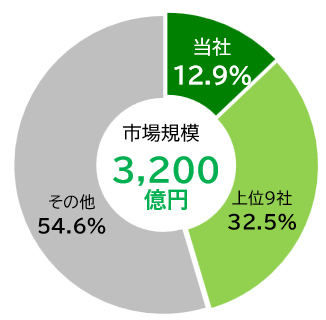 食品新聞記事を基に同社が作成した売上ランキングでは、同社は連結売上高415億円で、2位以下を大きく引き離し、シェア12.9%のトップである。以前から掲げている15%達成を目指しており、M&Aを含めてシェアアップを図っていく考えだ。