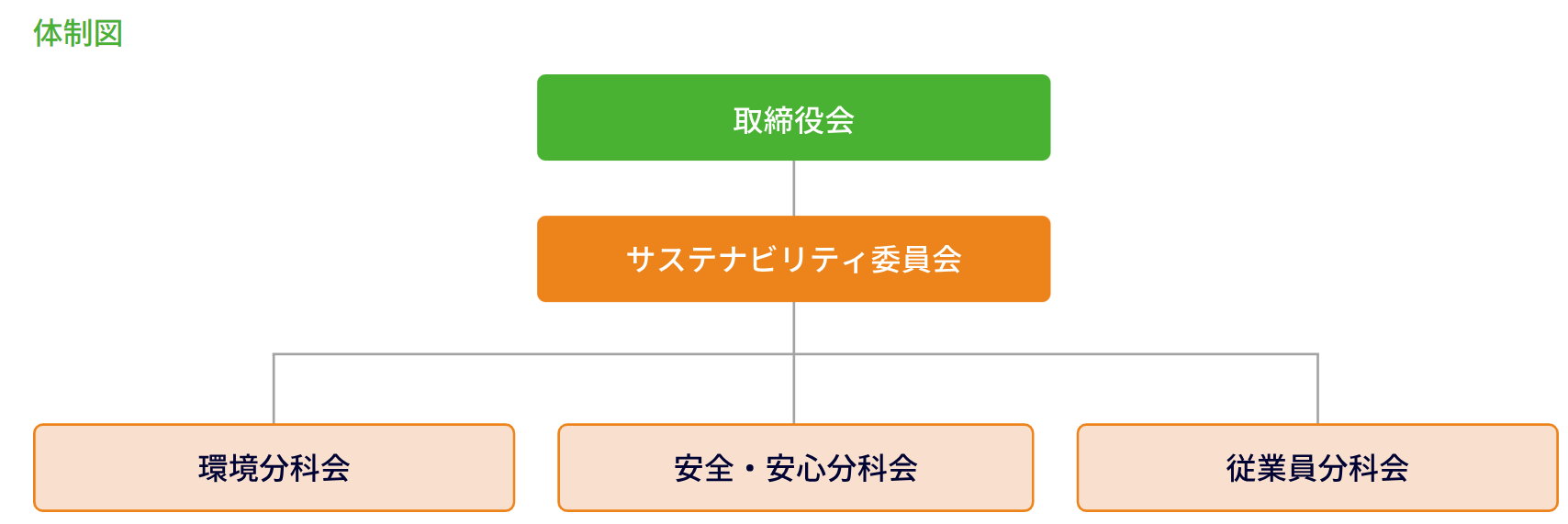 委員会の傘下には「環境」「安全・安心」「従業員」の3つの分科会を設置し、サステナビリティ経営を推進している。この体制のもと、SDGsへの取り組みをはじめサステナビリティに関わる重要な方針や目標の策定などを行っている。