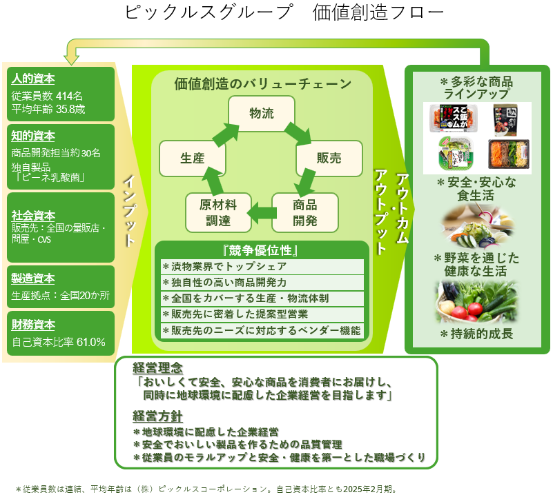 (なお本レポート中、「3.課題・マテリアリティと取り組み」においては、(株)ピックルスコーポーションにおける取り組みを中心に、一部、グループ会社における取り組みを記載している。また、「5.財務・非財務データ」においては、データごとに、連結((株)ピックルスコーポレーションを含むグループ会社)又は(株)ピックルスコーポレーションであることを明示している)