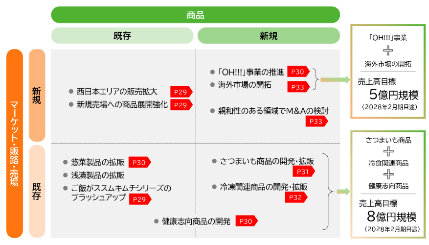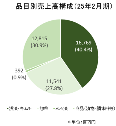 2025年2月期の品目別売上構成は、製品(自社工場で生産)売上が69.1%(浅漬・キムチ40.4%、惣菜27.8%、ふる漬0.9%)、 グループ会社(株)フードレーベル製品や他社仕入商品(自社工場以外での生産)売上が30.9%。