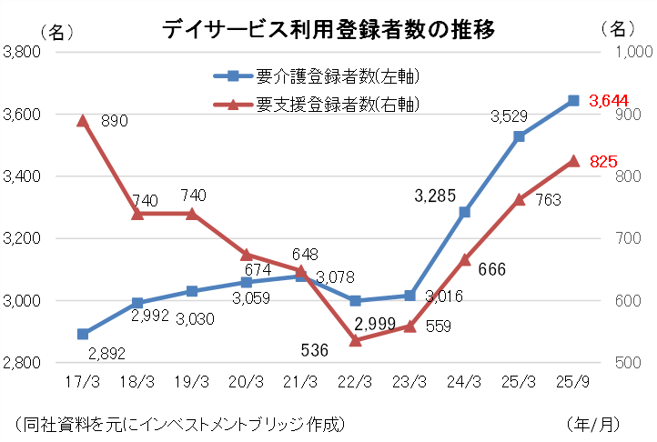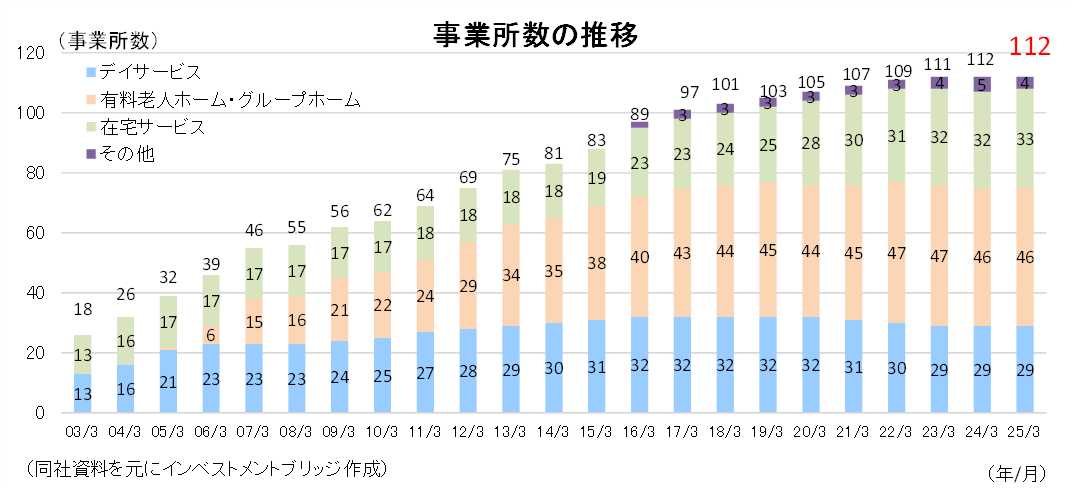 事業は、同社の施設の来場者にサービスを提供するデイサービス事業、有料老人ホーム等の施設の入居者を対象にサービスを提供する施設サービス事業、及び利用者の自宅を訪問して日常生活訓練や機能訓練等を行うリハビリサービスや日常生活の手伝いを行うホームヘルパーサービス等の介護サービスを提供する在宅サービス事業に分かれる。25/3期の売上構成比は、(内部売上高を除く)は、それぞれ21.9%、71.1%、6.5%。また、その他事業として、福祉用具事業、障害支援事業及び給食事業を展開する(25/3期の売上構成比は0.5%)。